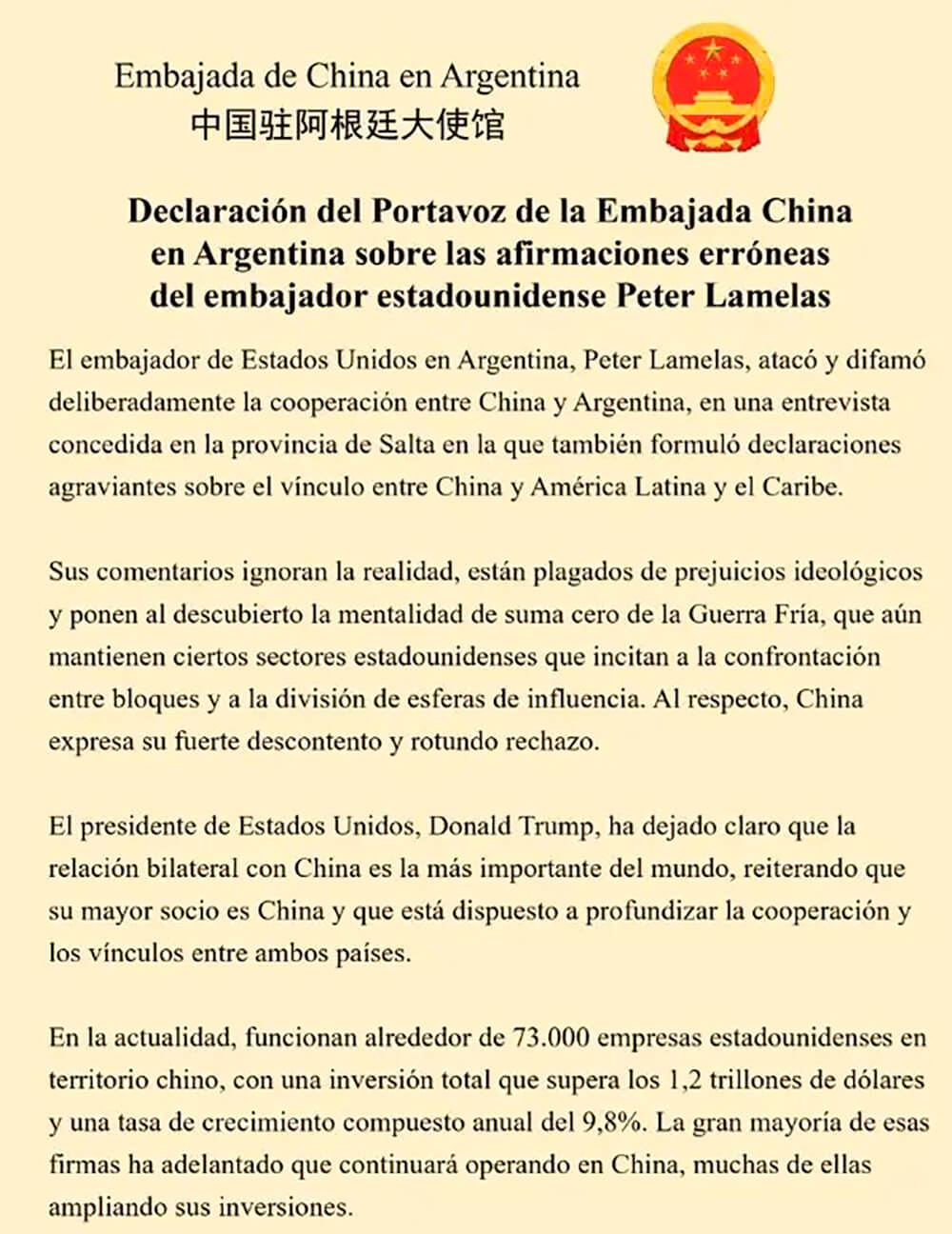 Comunicado Embajada de China en Argentina