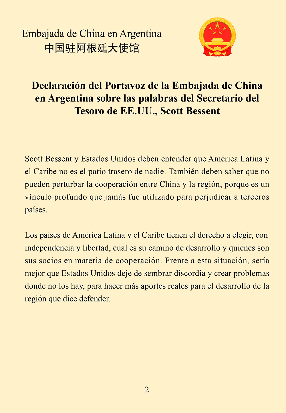 Declaración del Portavoz de la Embajada China en Argentina sobre las palabras de Scott Bessent
