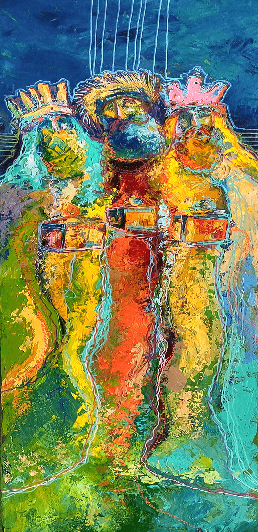 Colón incorpora a los Reyes en su arte a través de composiciones llenas de color y simbolismo, mezclando elementos tradicionales con una estética contemporánea. Aunque se separa de lo religioso, sus piezas destacan por resaltar la conexión entre los Reyes Magos y la identidad boricua (otra forma de llamar a los puertorriqueños).