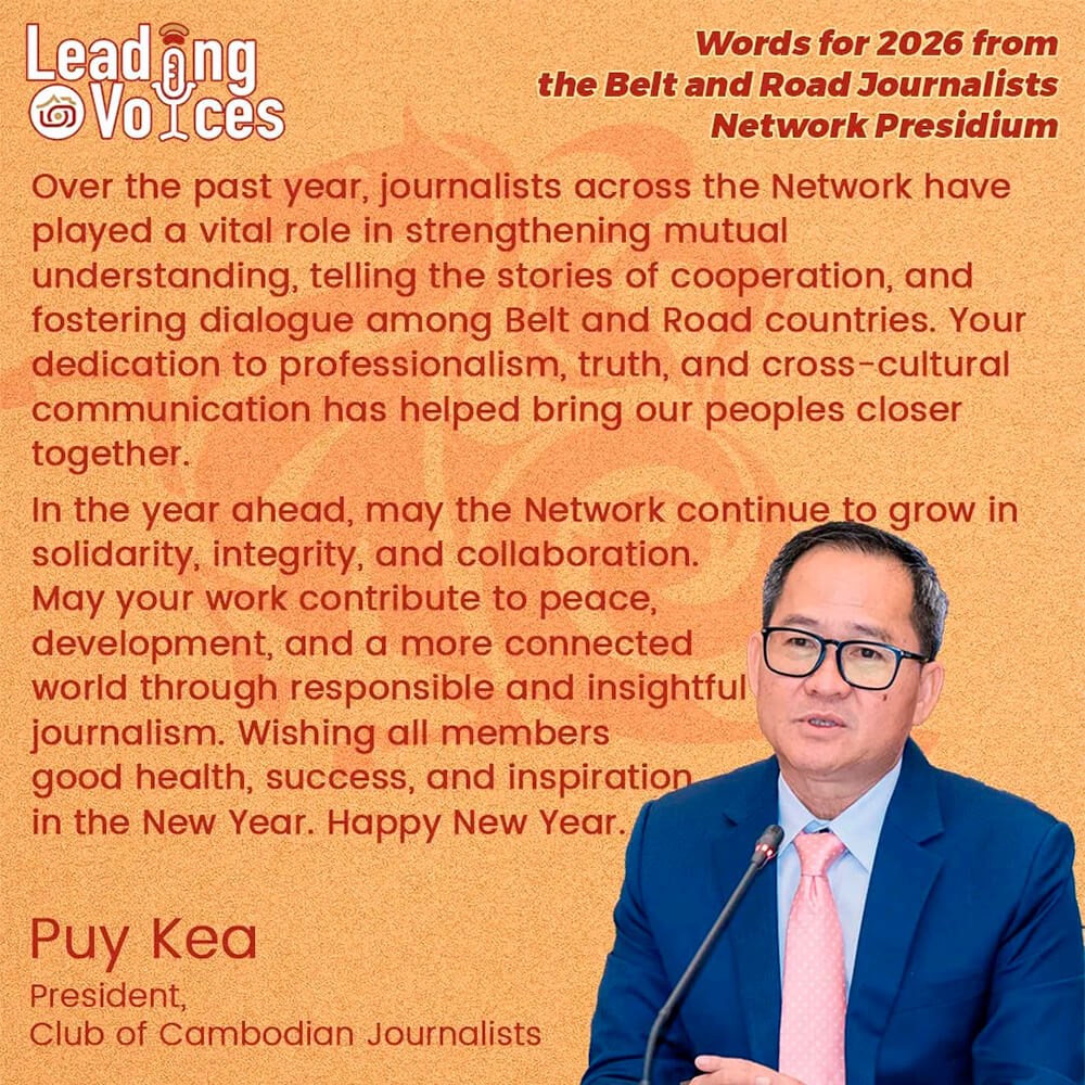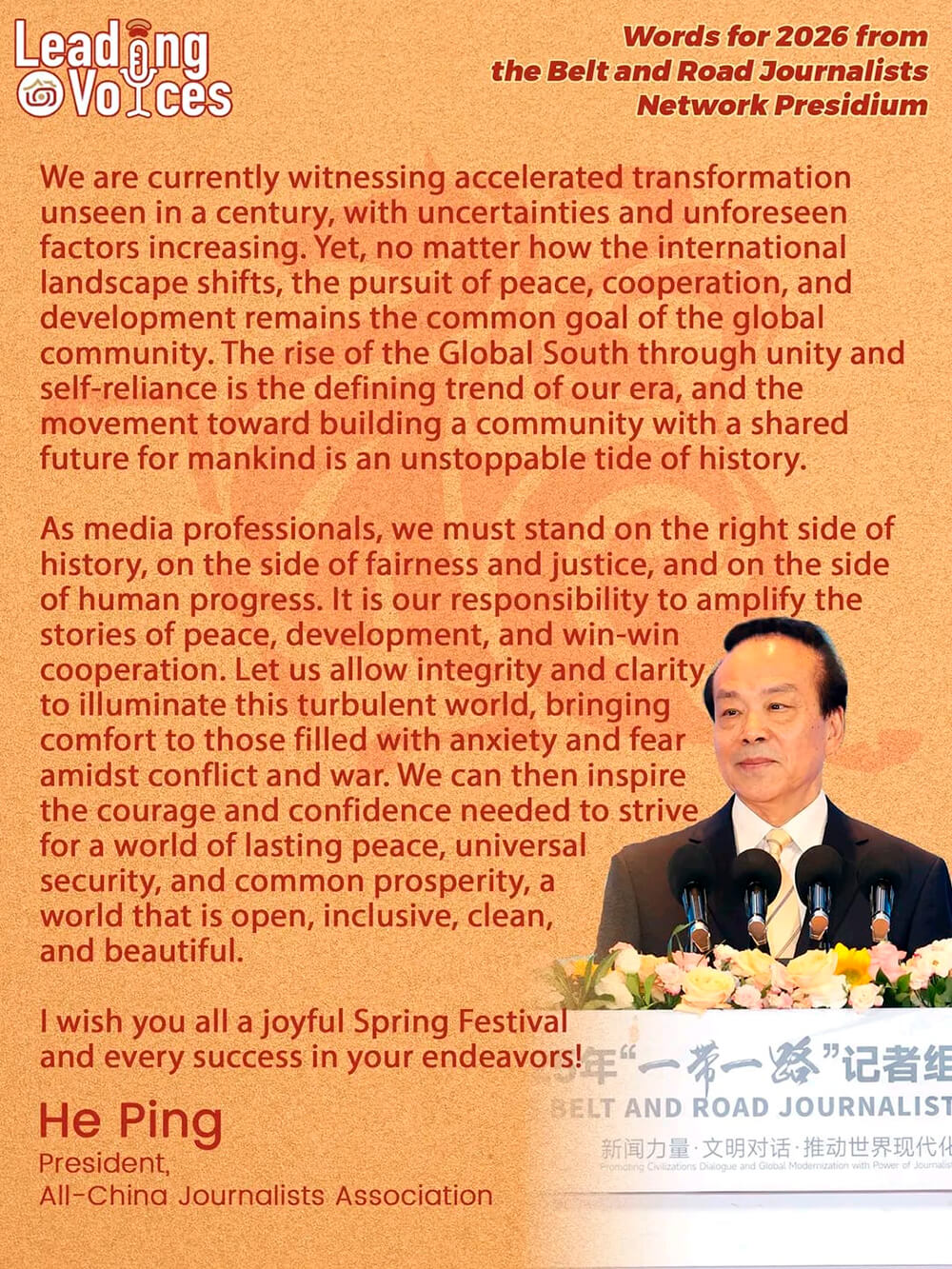 He Ping, presidente de la Asociación Nacional de Periodistas de China (ACJA) y miembro del presidium de la Red de Periodistas de la Franja y la Ruta (BRJN), transmitió sus saludos por el Festival de Primavera a periodistas y amigos de los medios de comunicación de todo el mundo. A continuación, el