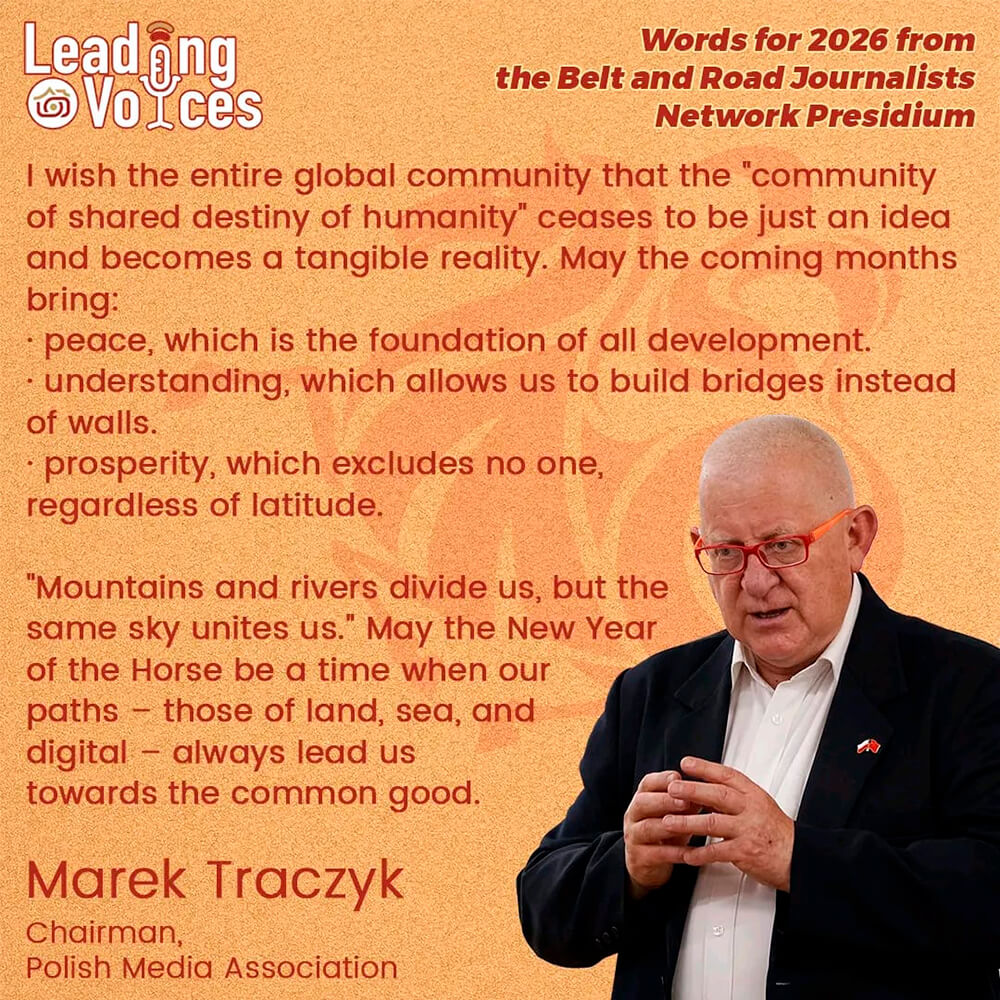 Señaló que, en la cultura china, el caballo simboliza determinación, confianza e impulso, un espíritu que refleja el trabajo diario de los periodistas. En un momento de profundos cambios globales, enfatizó la búsqueda compartida de la paz, la cooperación y el desarrollo, y animó a los profesionales de los medios a defender la equidad y la justicia, a mantener su compromiso con la verdad y a compartir más historias de paz, desarrollo, cooperación y resultados beneficiosos para todos, proyectando así una poderosa voz colectiva para